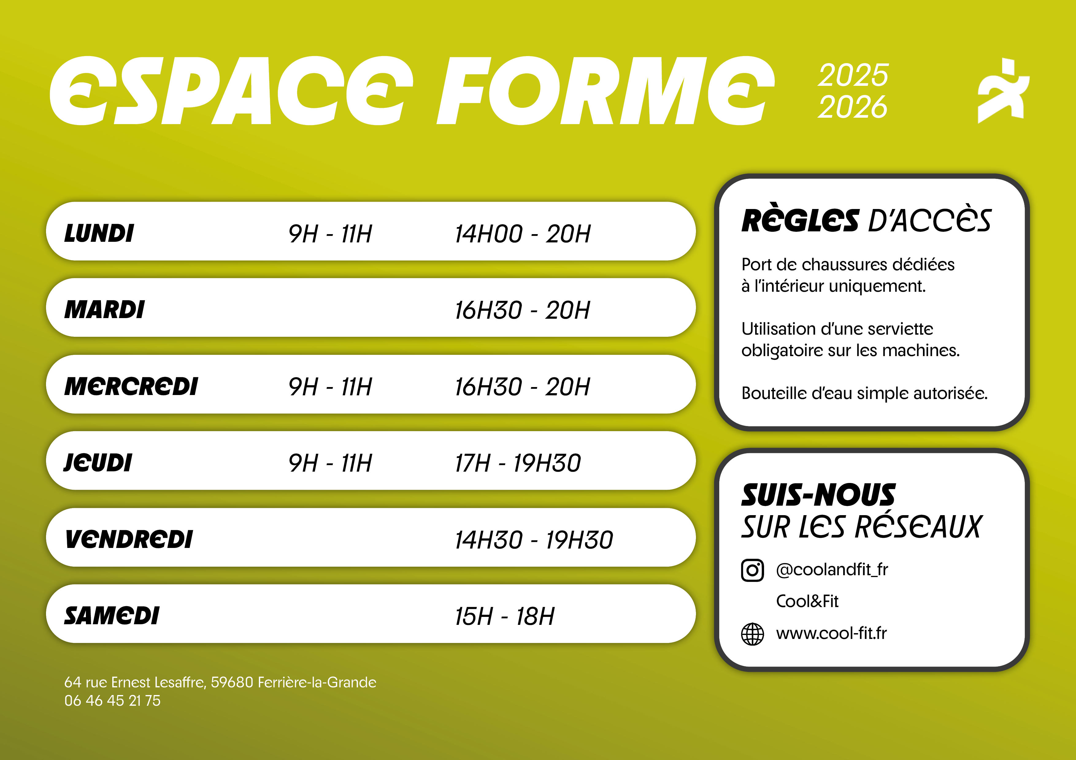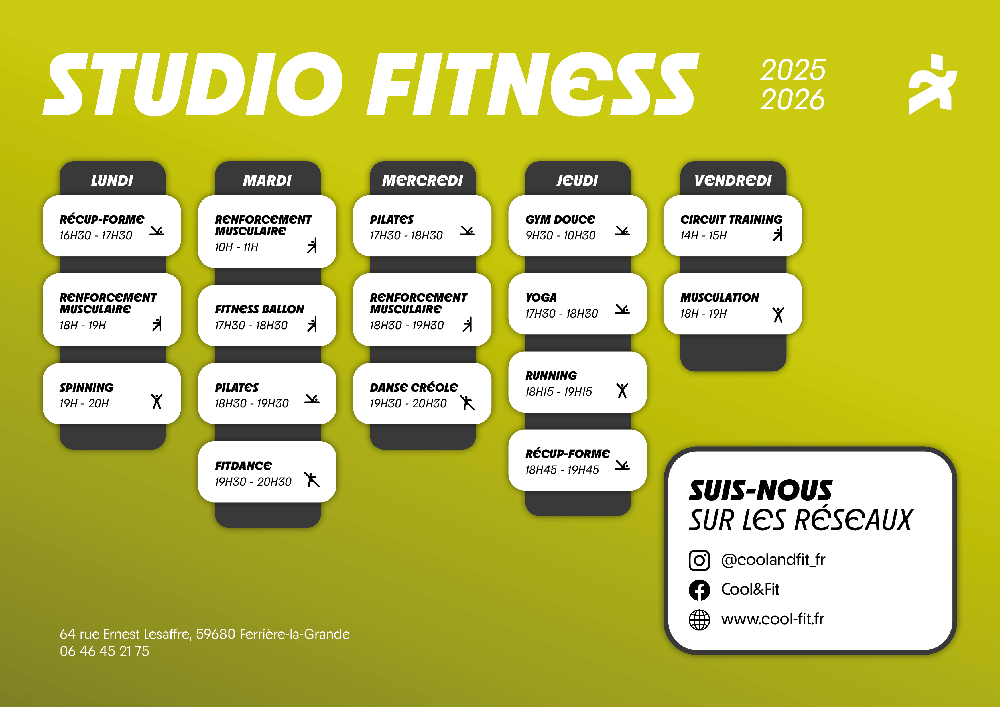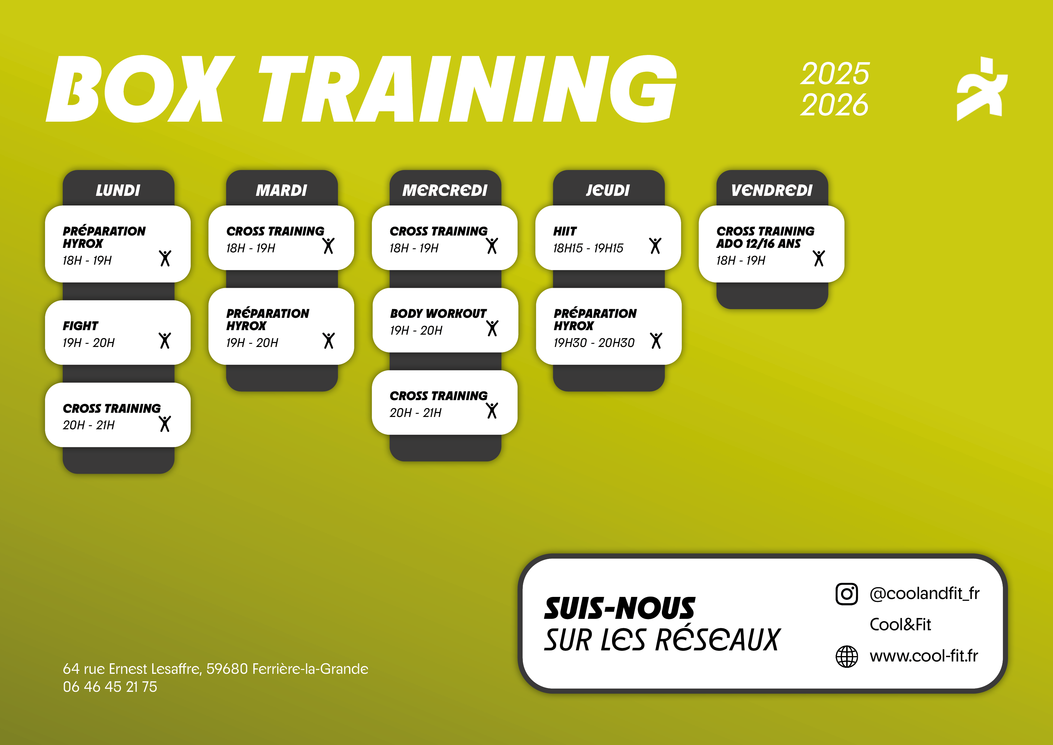 Cool & Fit est une salle de sport près de Maubeuge proposant divers services conjuguant à la fois cours collectifs, cours training et de musculation adaptés à tous les publics. Ces cours se déroulent suivant des plannings prévus, le matin, l’après-midi et en soirée.